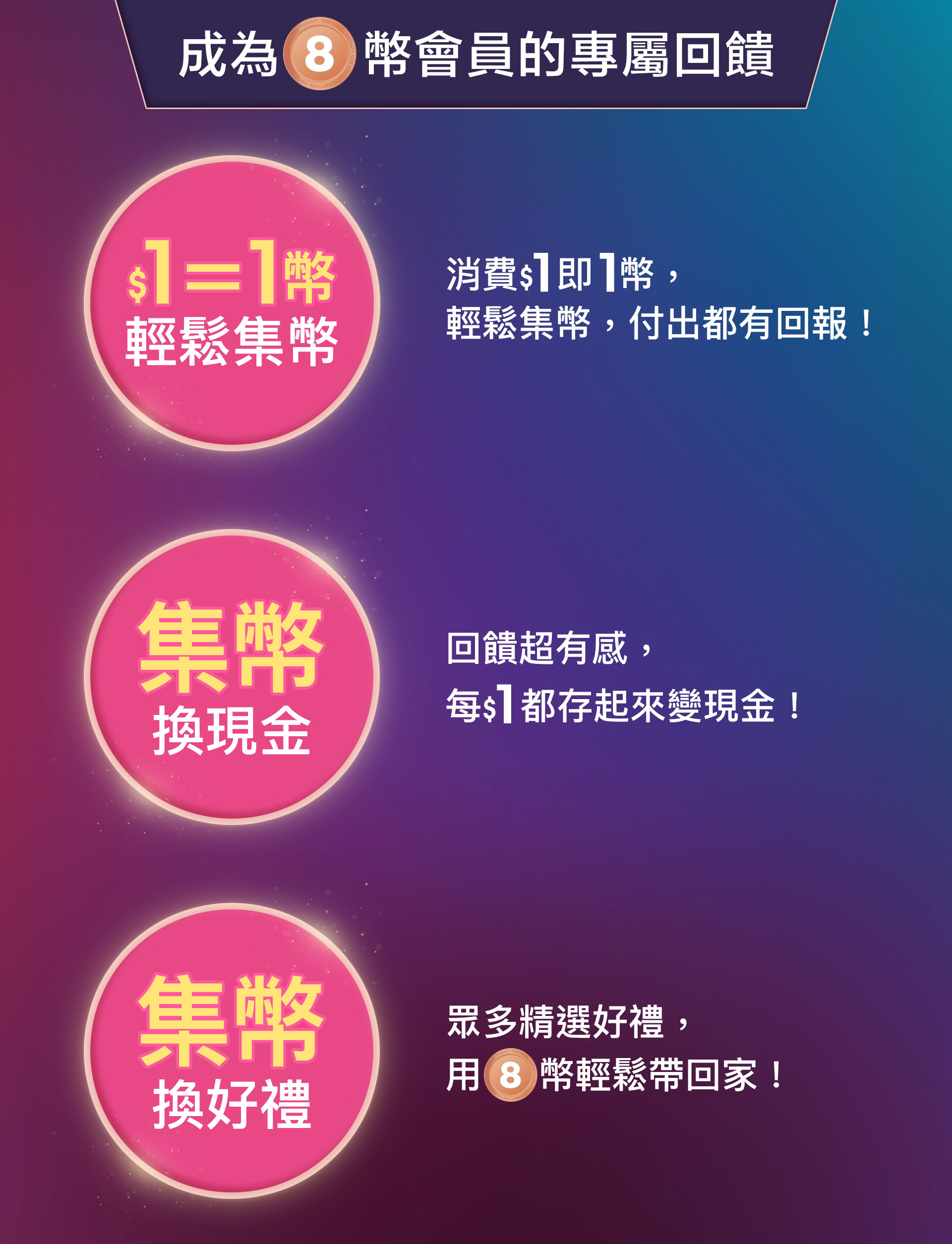 - 此8幣計畫為回饋性質,恕無法折換現金。