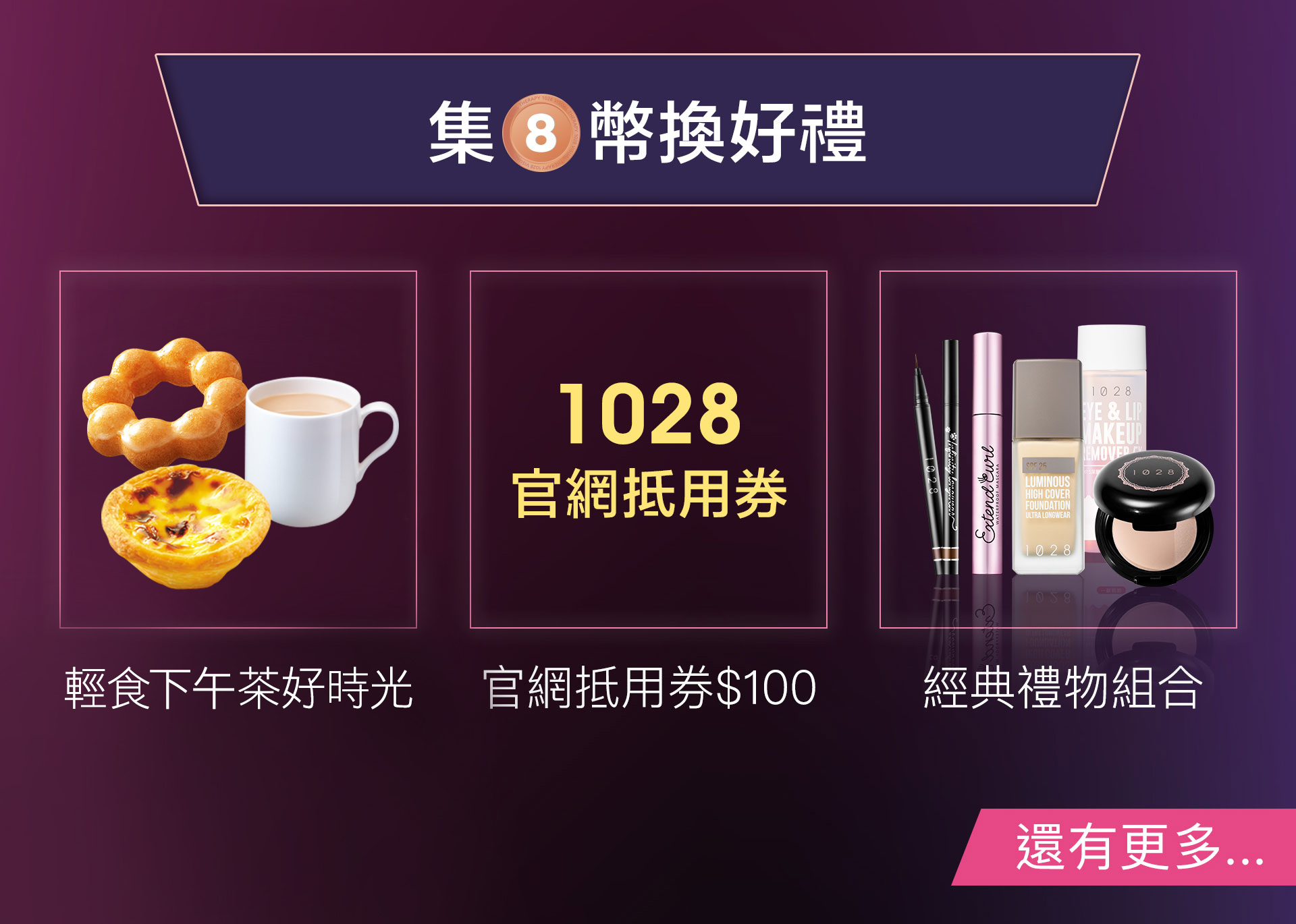 凡購買任一 1028 產品,於會員官網登錄有效發票 即享 1 元 1 幣回饋,累積⓼幣超好換,吃喝玩樂樣樣有!眾多好禮如電影票、百貨抵用券、機票、品牌產品等免費帶回家,讓你的每一筆消費都享有回饋!